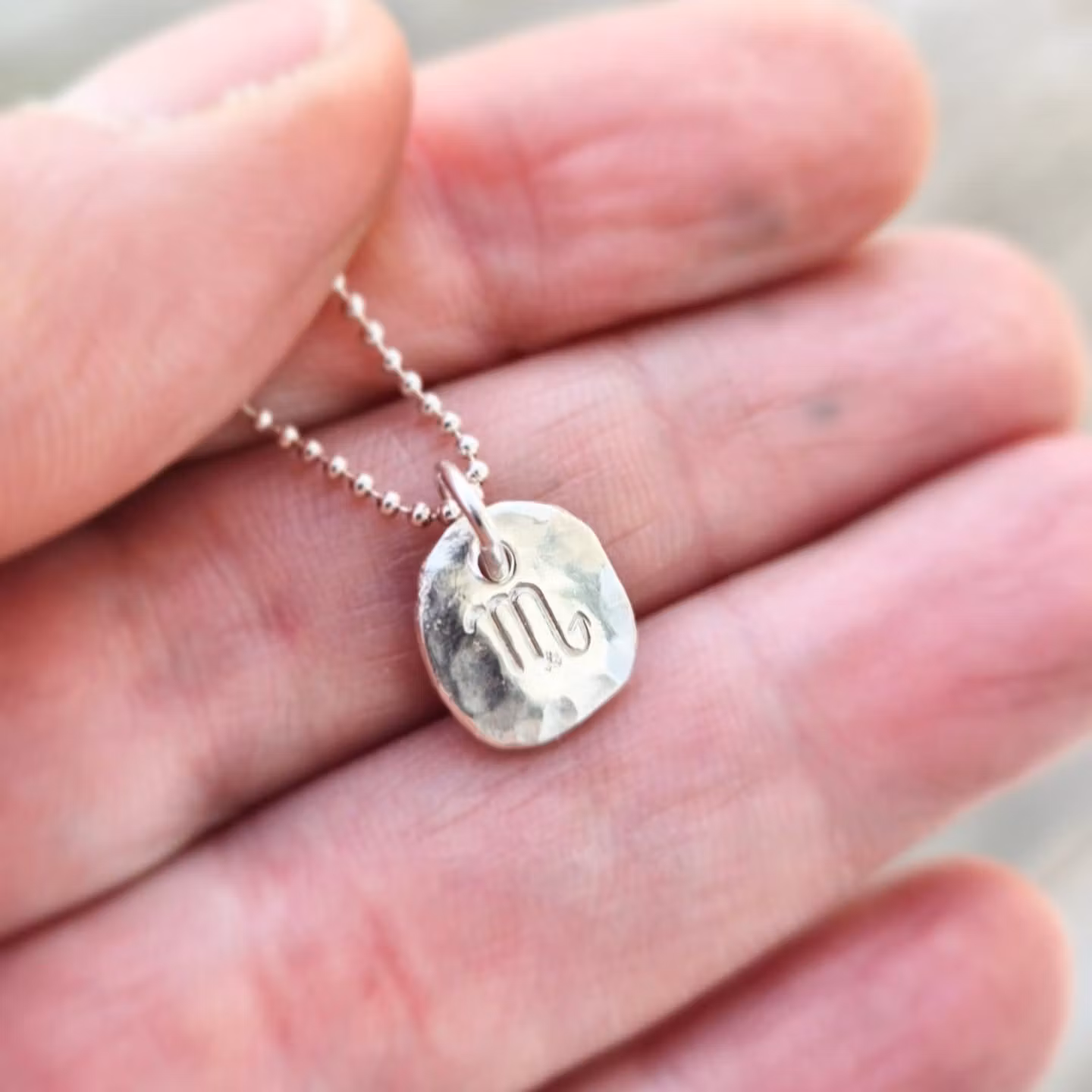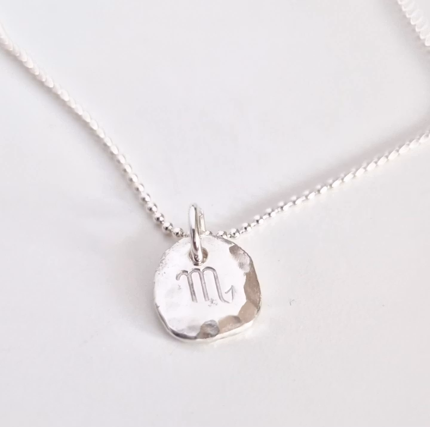Ett fint och handgjort hänge med stjärntecknet för skorpionen i återbrukat silver.