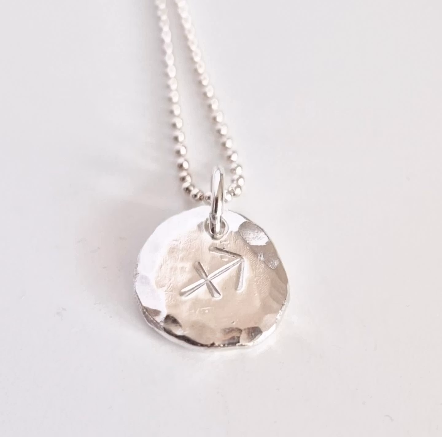 Ett fint och handgjort hänge med stjärntecknet för skytten i återbrukat silver.