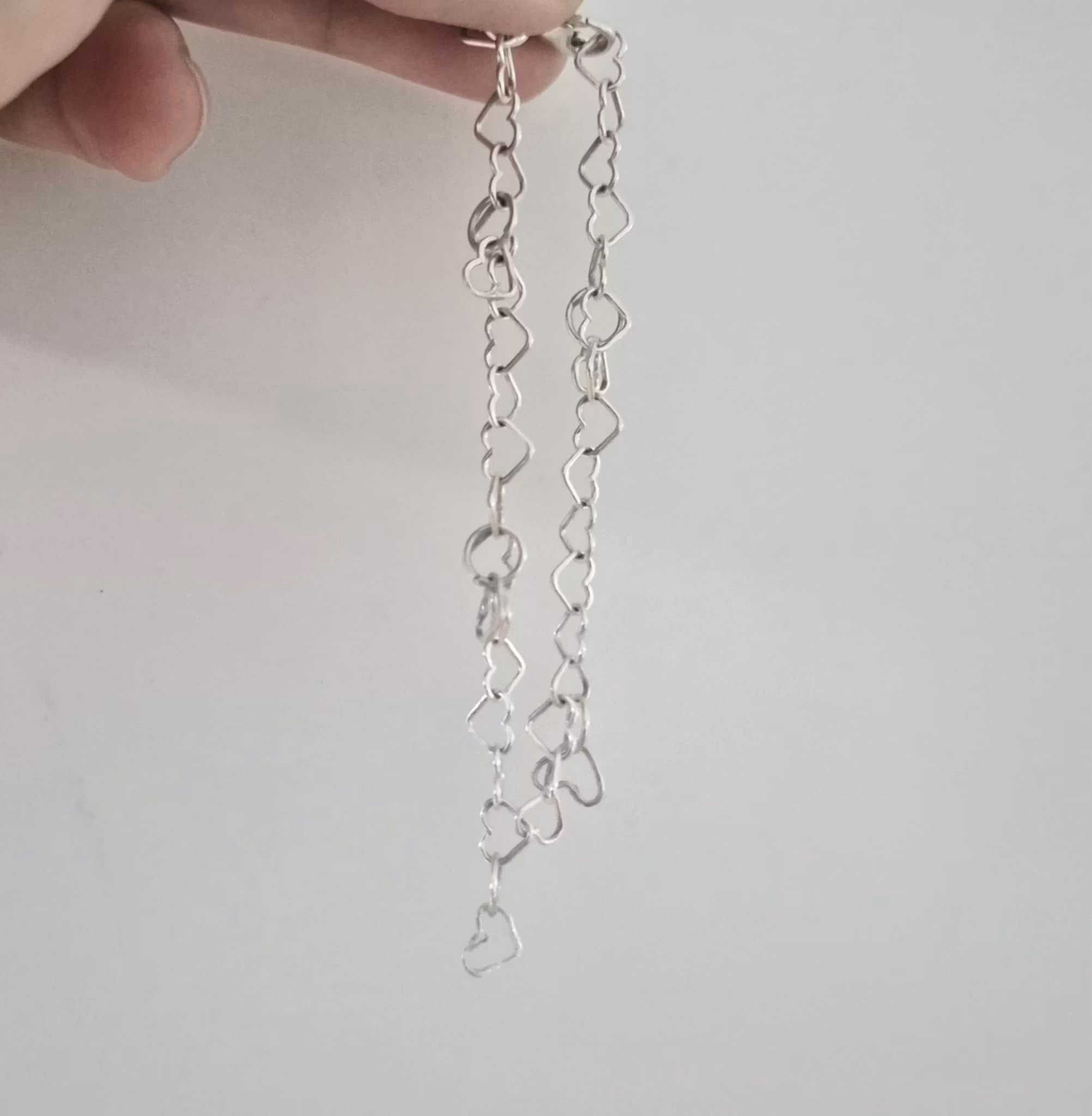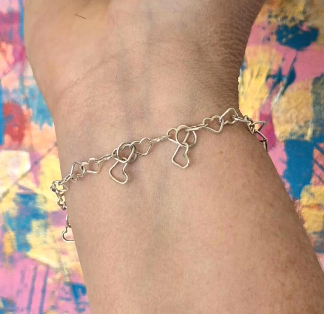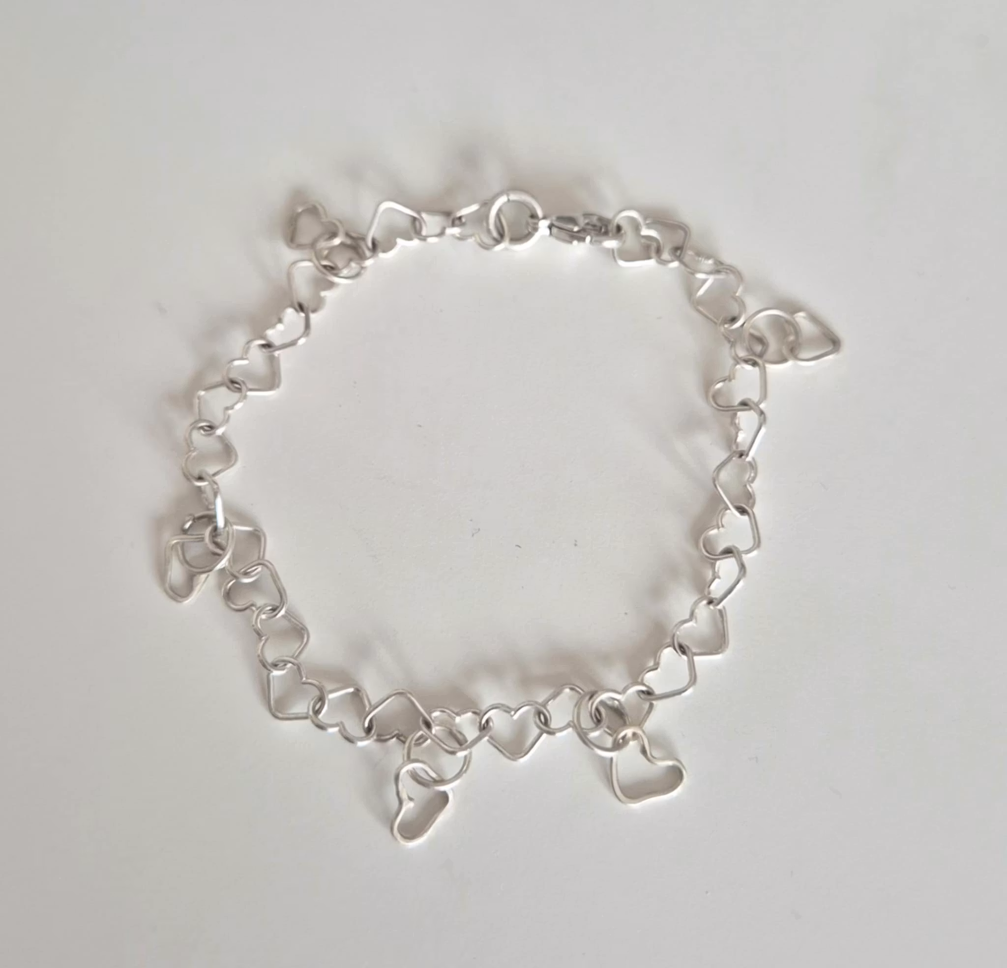 Ett fint hjärtansarmband i äkta silver med fem handgjorda hjärtansberlocker dinglandes.
