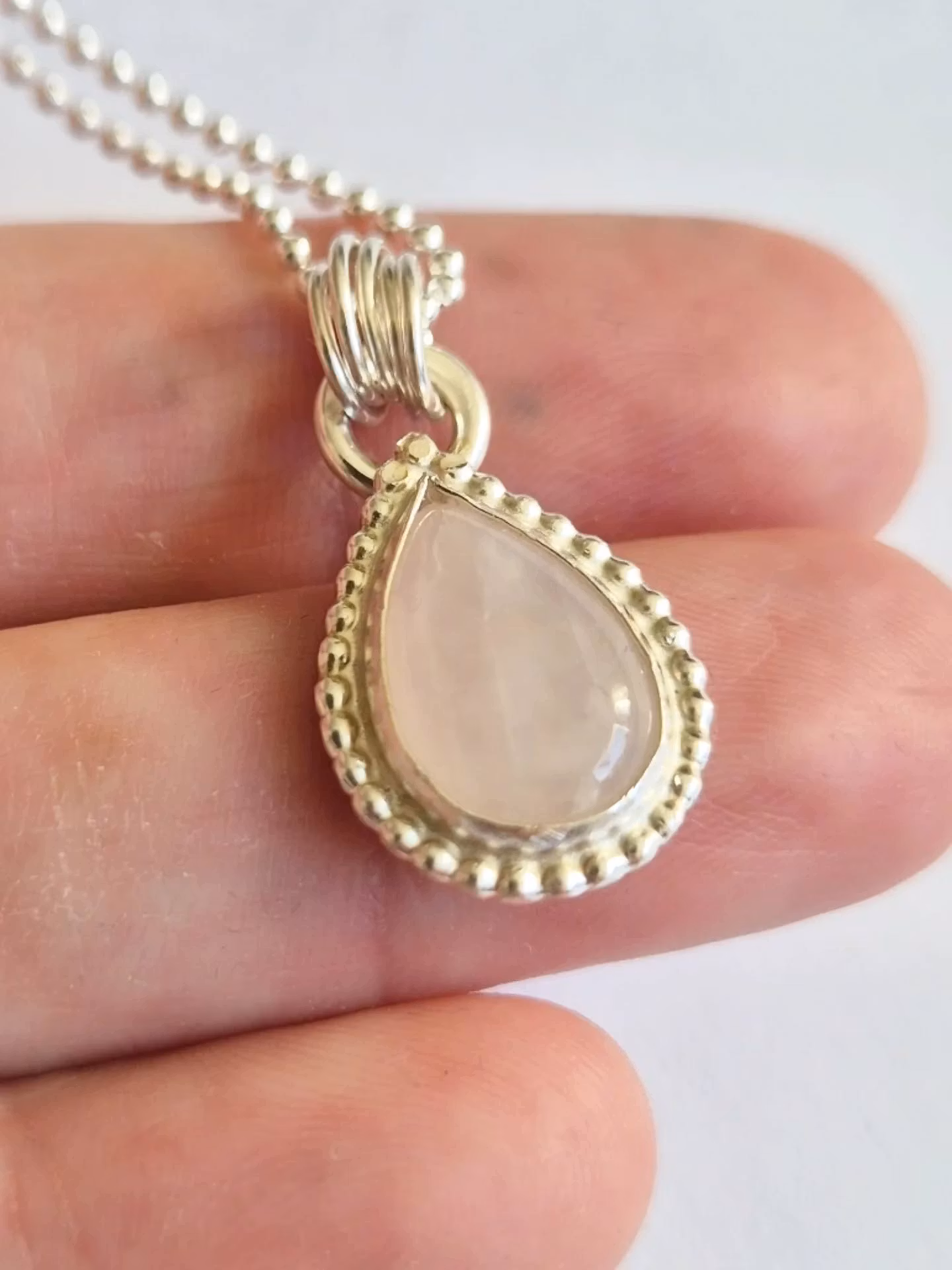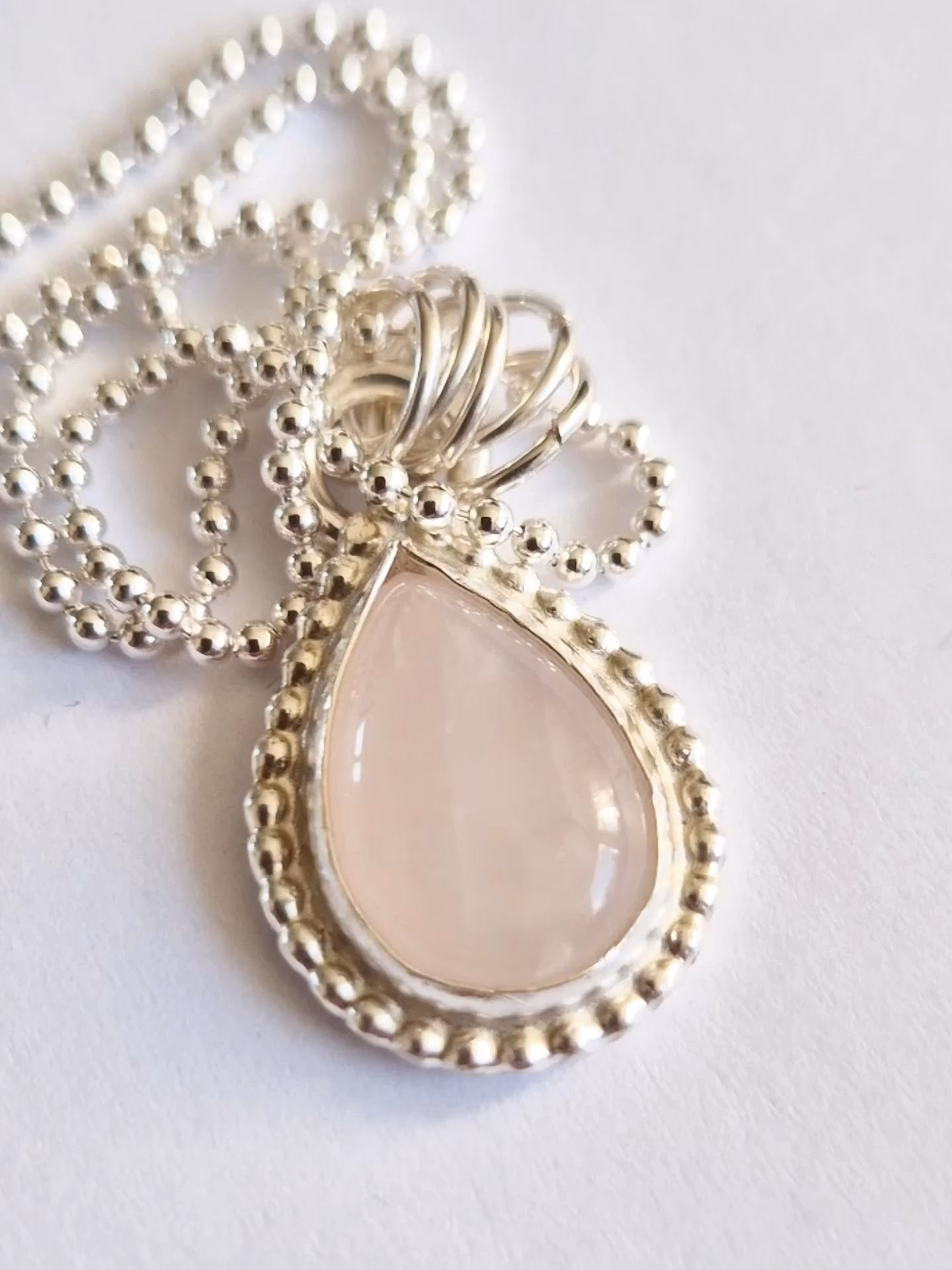 En fin handgjord berlock med en rosenkvars som är droppformad, infattad i äkta silver.
